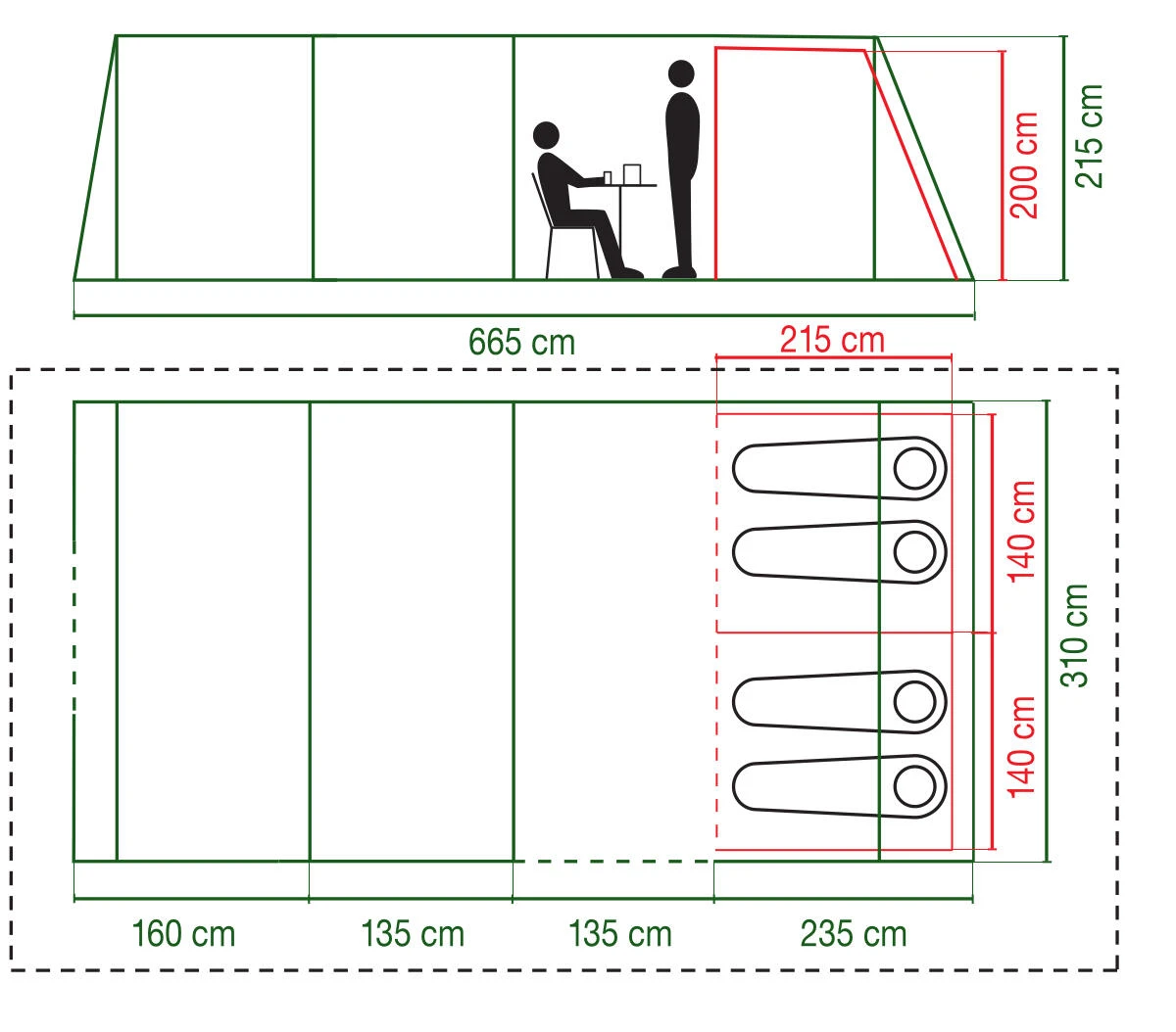 With a large living space, extended front porch and full head height throughout this tent will comfortably accommodate up to four people on the campsite. FastPitch Air technology enables swift pitching by a single person if required while the supplied Manometer clearly displays the optimum air pressure. The air poles and adjustable storm straps ensure the tent will stand firm and secure in more extreme wind conditions. Bedrooms are large, have soft Polyester floors and are hung with scalloped edges to even tension distribution for a perfect fit. Bedrooms also feature BlackOut Bedroom Technology, blocking up to 99% of light from entering the sleeping space, reducing the temperature during the day and increasing it at night, ensuring a more restful sleep for all the family. The spacious integrated front porch provides an additional living space, has large windows and a face which can be totally or partially removed for weather protection and comfort. Additional features include a drop down doorway providing barrier-free access for wheeled coolers and buggies as well as reducing possible trip hazards and a large full width vent at the rear of the tent to reduce the risk of condensation. A sturdy, wheeled storage bag enables ease of movement around the campsite.