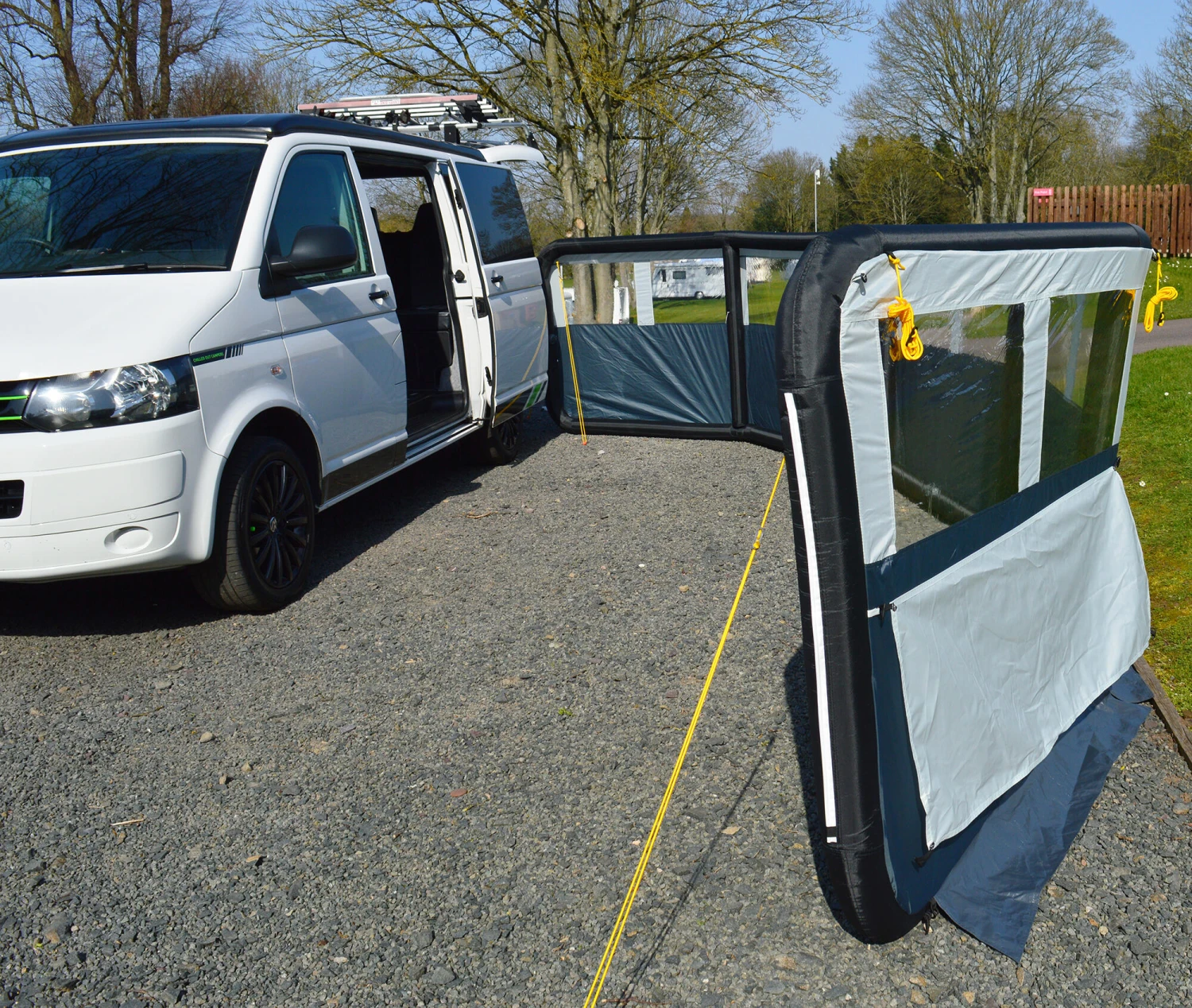 Maypole’s 5 panel single point inflation windbreak provides privacy and protection from the wind. The sturdy airframe is quick and easy to inflate via a single point air tube. The windbreak includes removable window covers for added privacy, and midway pegging points to keep your pets safely inside. Kadar strips on either end allow for caravan awning rail attachment, giving you extra stability. Hand pump, guy ropes, pegs and a compact carry bag are all included.